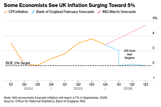 中东地区的战事引发的油气价格上涨正在给英国带来巨大的通胀风险。根据荷兰国际集团(ING)和RSM UK周一公布的估算,如果近期油气价格上涨得以维持,英国通胀率可能升至英国央行2%目标的两倍以上。此前,布伦特原油自2022年以来首次突破每桶100美元。荷兰国际集团经济学家詹姆斯·史密斯表示,如果油价在第二季度持续上涨,那么到9月通胀率将达到4.7%。RSM UK经济学家汤姆·皮尤则估计将导致通胀率在4.5%至5%之间。